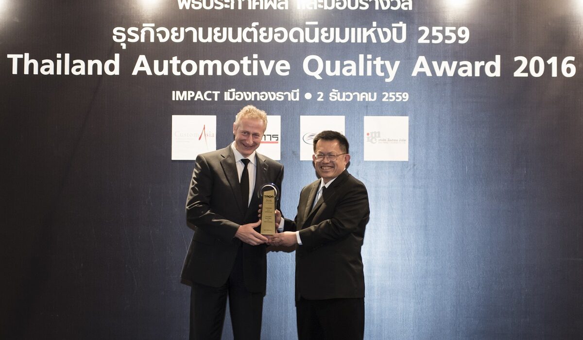 บริษัท เมอร์เซเดส-เบนซ์ (ประเทศไทย) จำกัด นำโดย มร. อันเดรอัส เลทเนอร์ (ซ้าย) ประธานบริหาร บริษัท เมอร์เซเดส-เบนซ์ แมนูแฟคเจอริ่ง (ประเทศไทย) จำกัด ร่วมแสดงความภูมิใจกับความสำเร็จเนื่องในโอกาสที่เมอร์เซเดส-เบนซ์ ได้รับรางวัล “ธุรกิจยานยนต์ยอดนิยม” แห่งปี 2559 หรือ TAQA Award 2016 รางวัลที่เกิดจากการสำรวจความพึงพอใจของผู้บริโภคต่อผลิตภัณฑ์รถยนต์และการบริการของรถยนต์ยี่ห้อต่างๆ โดยเมอร์เซเดส-เบนซ์ ได้รับรางวัลอันทรงเกียรติถึง 2 รางวัลด้วยกัน ได้แก่ รางวัลธุรกิจยานยนต์ยอดนิยมด้านภาพลักษณ์ดีเด่นประเภทความปลอดภัยระดับสูง และรางวัลธุรกิจยานยนต์ยอดนิยมด้านภาพลักษณ์ดีเด่นประเภทเทคโนโลยีระดับสูง ซึ่งนับเป็นการตอกย้ำภาพลักษณ์ความเป็นผู้นำแห่งนวัตกรรมยานยนต์ระดับพรีเมี่ยมของค่ายเมอร์เซเดส-เบนซ์ได้เป็นอย่างดี ณ ห้องจูปิเตอร์ 4-5 ชาเลนเจอร์ ฮอลล์ อิมแพ็ค เมืองทองธานี เมื่อเร็วๆ นี้