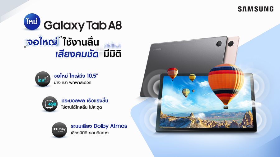เริ่มต้นสัมผัสแรกของการใช้งาน Galaxy Tab A8 ด้วยดีไซน์แท็บแล็ตอันเป็นเอกลักษณ์ รวมถึงผิวสัมผัสอันน่าหลงใหลแบบเดียวกับที่ใช้ในแท็บเล็ตรุ่นแฟลกชิป Galaxy Tab S Series โดยแท็บเล็ตรุ่นนี้มาพร้อมกับน้ำหนักที่เบา หน้าจอขนาดใหญ่ 10.5 นิ้ว และขอบจอบางเฉียบ ด้วยอัตราส่วนหน้าจอต่อตัวเครื่องที่ 16:10 หรือนับเป็น 80% ของขนาดทั้งหมด ซึ่งจะมอบประสบการณ์การรับชมที่สมจริงมากกว่าแท็บเล็ตรุ่นก่อนๆ ไม่ว่าจะชมรายการโปรด เล่นเกมกับเพื่อนๆ หรือวิดีโอคอลกับครอบครัว ตลอดจนการเรียนออนไลน์และทำงาน พร้อมคุณสมบัติที่ช่วยให้ดื่มด่ำไปกับความบันเทิงได้อย่างเต็มอิ่ม ด้วยลำโพง 4 ตัว Quad-Speaker และระบบเสียงของ Dolby Atmos® ที่มีใน Galaxy Tab A8 จะยิ่งช่วยมอบคุณภาพเสียงที่สมบูรณ์แบบ ดังชัดแบบ 3D รอบทิศทาง พร้อมรายละเอียด ความลึก และความสมจริงของเสียงที่ไม่มีใครเทียบได้