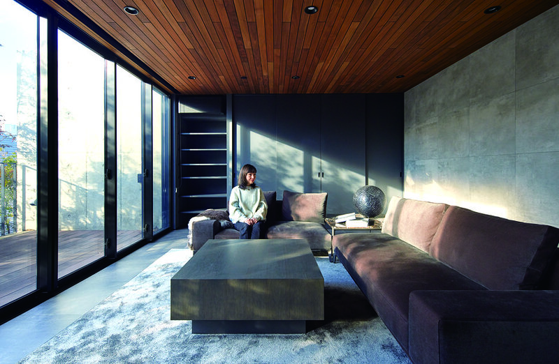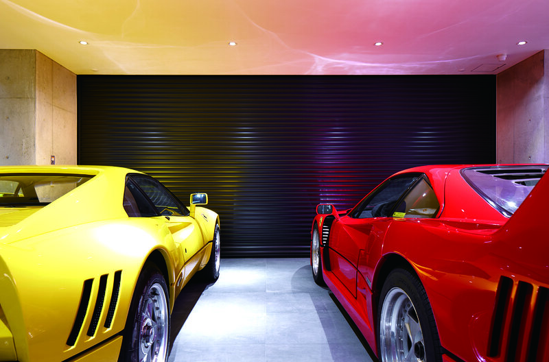 เราถูกขอให้ออกแบบบ้านหลังที่สอง ซึ่งใช้งานโรงจอดรถเป็นหลัก เราวางแผนอย่างรอบคอบในการก่อสร้างบนพื้นที่ลาดชัน (ชั้นใต้ดิน 1 ชั้น เหนือพื้นดิน 1 ชั้น) เนื่องจากต้นทุนการก่อสร้างจะต่างกันมาก ขึ้นอยู่กับวิธีการก่อสร้าง ชั้น 1 จะใช้เก็บรถมีชื่อหลายคัน แต่แทนที่จะสร้างบรรยากาศที่หรูหราเหมือนโชว์รูม เราอยากออกแบบให้รถเหล่านั้นเหมือนจอดอยู่ในถ้ำที่เงียบสงบ จึงตกแต่งห้องด้วยหิน (ด้าน) และคอนกรีตเปลือย เพื่อให้ดูเงียบสงบ และแสงจะถูกควบคุมโดยไฟจากด้านบนในตอนกลางวัน และไฟจากบนพื้นและเพดานในเวลากลางคืน และมีเงาทอดลงบนรถบ้าง อุปกรณ์ต่างๆ ถูกเก็บให้พ้นสายตา โดยเฉพาะตัวเครื่องของระบบระบายไอเสียจะฝังอยู่ใต้พื้น บันไดที่นำไปสู่ชั้นใต้ดิน ได้รับการออกแบบให้รู้สึกเหมือนกำลังเดินไปยังที่ซ่อนตัว สร้างห้องนั่งเล่นชั้นใต้ดินโดยใช้ประโยชน์จากพื้นที่ลาดเอียง ทำดาดฟ้าและสวนต้นไม้ สร้างพื้นที่อันเงียบสงบที่ให้ความรู้สึกโล่งสบาย เมื่อเปิดชัตเตอร์ฝั่งถนนออก จะพบกับพื้นที่ภายในที่น่าหลงใหลจนไม่อาจจินตนาการได้จากภายนอก