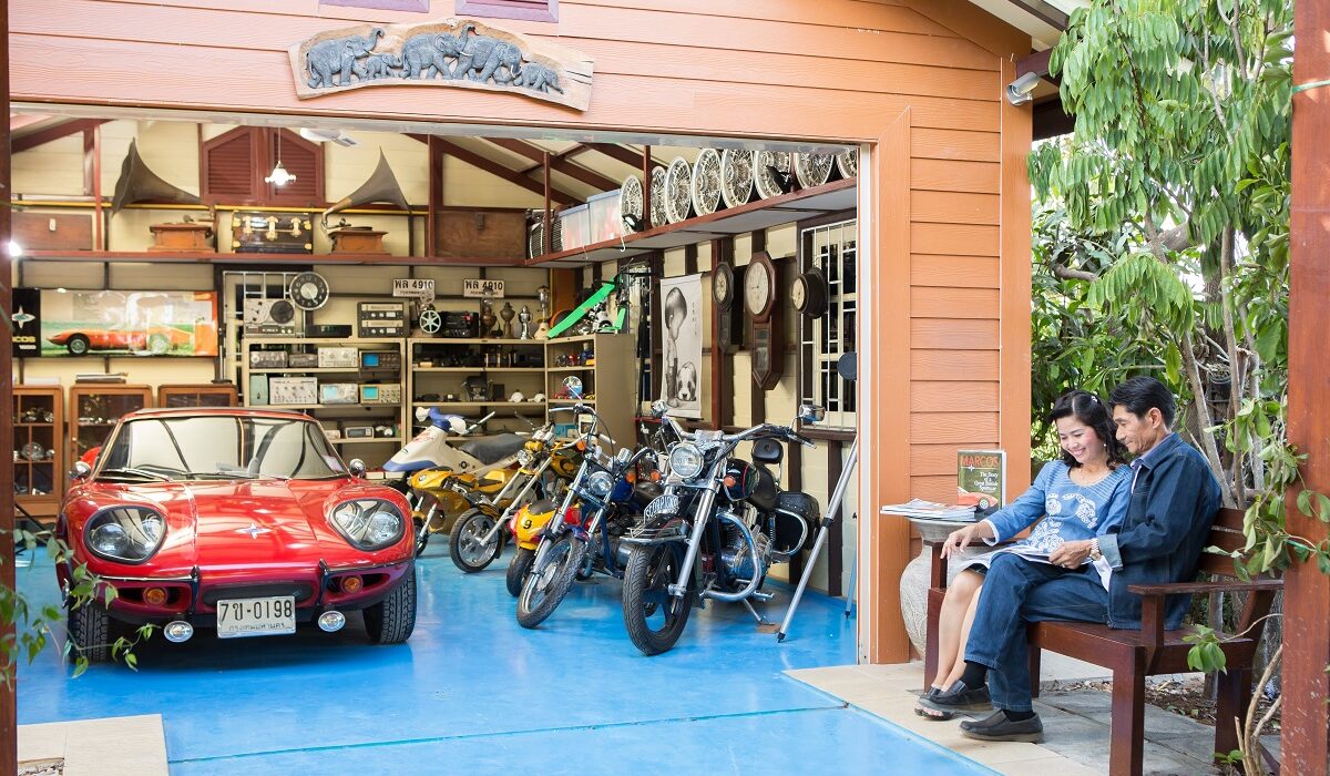 ภายในโรงจอดรถเต็มไปด้วยไอเดียของคุณสุชาติ ตั้งแต่การจัดเก็บของ ไปจนถึงพวกอะไหล่สำรองที่เก็บไว้ซ่อมบำรุงรถคันโปรดที่มีประสิทธิภาพ การตกแต่งในแบบของตัวเอง สิ่งต่างๆ เหล่านี้เขาคิดออกมาด้วยตัวเองทั้งหมด