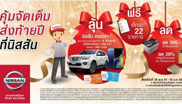 นิสสัน มอเตอร์ ประเทศไทย จัดแคมเปญส่งท้ายปลายปีเพื่อลูกค้าคนสำคัญ ด้วยการให้บริการตรวจเช็คสภาพรถยนต์ฟรี 22 รายการ ร่วมลุ้นรับรางวัลอีกมากมาย มูลค่ารวมทั้งสิ้นประมาณ 4 ล้านบาท