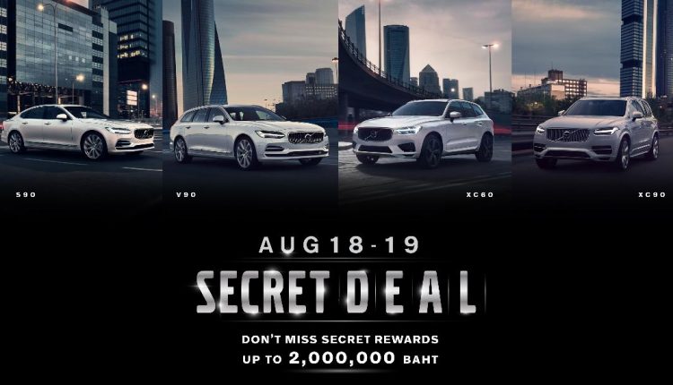 วอลโว่ คาร์ ประเทศไทย จัดแคมเปญ Secret Deal สำหรับรถยนต์วอลโว่ทุกรุ่นที่ซื้อผ่านทางโชว์รูมวอลโว่เท่านั้น จัดระหว่างวันที่ 18-19 สิงหาคม 2561 และส่งมอบรถยนต์วอลโว่ก่อนวันที่ 30 กันยายน 2561