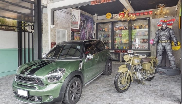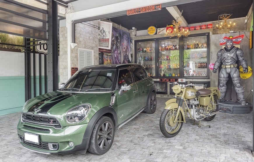 เพราะอยากได้พื้นที่ส่วนตัวไว้สังสรรค์กับเพื่อนๆ และสามารถอยู่ได้ทั้งวันโดยไม่รู้สึกเบื่อ จึงออกแบบโรงจอดรถให้เข้ากับไลฟ์สไตล์ของตนเองที่ชื่นชอบบรรยากาศแบบ rock ในยุค 80s และเป็นที่มาของอีกหนึ่งมุมโปรดในบ้าน ที่เต็มไปด้วยของสะสมที่ชื่นชอบ