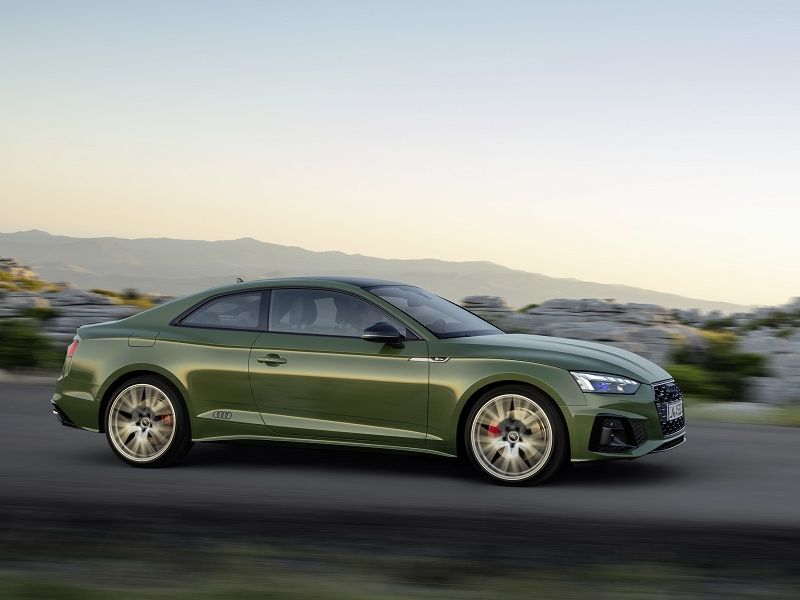 New Audi A5 Coupé 45 TFSI quattro S line Black Edition ถูกออกแบบตามแนวทางการออกแบบใหม่ที่โดดเด่นมีเอกลักษณ์เฉพาะตัว มุมมองของตัวรถตั้งแต่ด้านหน้าถึงด้านท้ายเฉียบคมลงตัว สปอร์ตเรียบหรู สะดุดตาเป็นอย่างมาก และยังมีทางเลือกใหม่ที่ไม่เหมือนใครในเซ็กเม้นต์รถหรูกับเทรนด์แฟชั่นสีภายนอกใหม่ District Green หรือสีเขียวทหารพราน ตัดกับคาลิปเปอร์เบรกสีแดงหน้า-หลัง