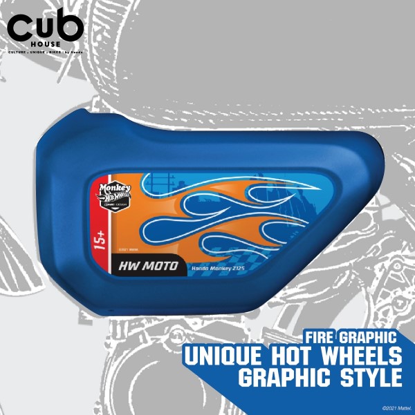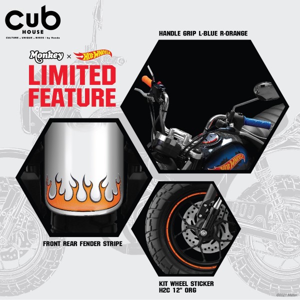 Monkey x Hot Wheels Limited Edition ได้รับการออกแบบให้มีความโดดเด่นไม่เหมือนใคร ด้วยการนำ Element สีส้ม-น้ำเงิน และกราฟิกลายเปลวไฟมาผสานกันอย่างสมบูรณ์แบบ เริ่มจากถังน้ำมันแบล็กคาร์บอนไล่เฉดสี คาดด้วยโลโก้ Hot Wheels ด้านข้างรถหุ้มด้วยคาร์บอนไฟเบอร์สีส้มพร้อมสัญลักษณ์ TH หรือ Treasure Hunts มาพร้อมครอบกรองอากาศสีน้ำเงินตกแต่งด้วยกราฟิกลายเปลวไฟ บังโคลนหน้าตกแต่งด้วยกราฟิกลายเปลวไฟ ปลอกแฮนด์ส้มน้ำเงินสลับสีสองข้าง ล้อ 12 นิ้วสีดำตกแต่งด้วยขอบล้อสีส้ม