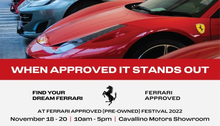 คาวาลลิโน มอเตอร์ เฟอร์รารี่ ประเทศไทย ขนทัพรถ Ferrari Pre-owned จากเจ้าของรถตัวจริงมาให้ได้เลือกชมแบบจุใจ พร้อมรถเดโมราคาสุดพิเศษ กับข้อเสนอที่ดีที่สุดในงาน “Ferrari Approved (Pre-owned) Festival 2022” ระหว่างวันที่ 18-20 พฤศจิกายน 2565 ที่โชว์รูมคาวาลลิโน มอเตอร์ ถนนเพชรบุรีตัดใหม่