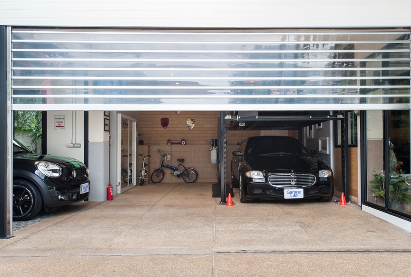 หนึ่งในความต้องการของคุณอภิวุฒิ นั่นคือ อยากได้ประตูโรงจอดรถแบบโปร่ง เพราะไม่ต้องการให้โรงจอดรถมืดจนเกินไป จึงเลือกใช้ประตูของ V.C. Autoshutters รุ่น PC100 แบบซีทรู ส่วนหลอดไฟที่ให้แสงสว่างในโรงจอดรถใช้หลอดประหยัดแบบฟลูออเรสเซนต์ที่ให้แสงนุ่มนวล ทำให้รถดูโดดเด่นยิ่งขึ้น