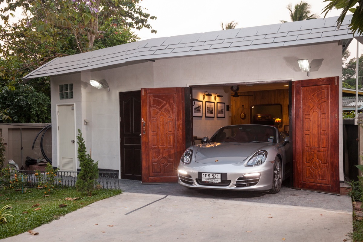 เนื่องจากเป็นการใช้พื้นที่ที่เหลือของบริเวณบ้านมาทำโรงจอดรถ จึงมีข้อจำกัดในเรื่องของขนาด อีกทั้งไม่ต้องการที่จะไปต่อเติมในส่วนที่เป็นที่จอดรถเดิมของบ้าน จึงไม่ใช่เรื่องง่ายที่จะทำให้โรงจอดรถออกมาดูดีสมใจ ส่วนขอข้องใจของผม คุณ G เล่าว่า “เนื่องจากต้องคอยขับรถไปมาระหว่างบ้านที่หัวหิน กับกรุงเทพฯบ่อยๆ เพราะต้องดูแลธุรกิจ ดังนั้นในช่วง 2-3 เดือนแรกที่ซื้อเจ้า Boxster มาจึงใช้เดินทางค่อนข้างมาก แต่พอโรงจอดรถที่นี่เสร็จ ก็มาอยู่ที่นี่แทน รถก็เลยไม่ค่อยได้ใช้ ส่วนใหญ่จะจอดไว้ในโรงจอดรถ ก็คิดซะว่า มีรถเป็นเพื่อนนั่งฟังแผ่นเสียงด้วยกัน บางครั้งก็มีเพื่อนๆ มาปาร์ตี้ ทำบาร์บีคิว กันบ้าง การมีโรงจอดรถก็ทำให้บรรยากาศเวลาปาร์ตี้น่าสนใจไปอีกแบบ ทุกวันนี้ พอกลับจากทำงานทุกคืนผมจะมานั่งฟังเพลงในโรงจอดรถ ผมว่า มันเป็นพื้นที่ส่วนตัวที่ไม่ไปรบกวนคนในบ้าน แถมยังมีความสุขกับงานอดิเรกที่ชอบได้อย่างเต็มที่อีกด้วย”