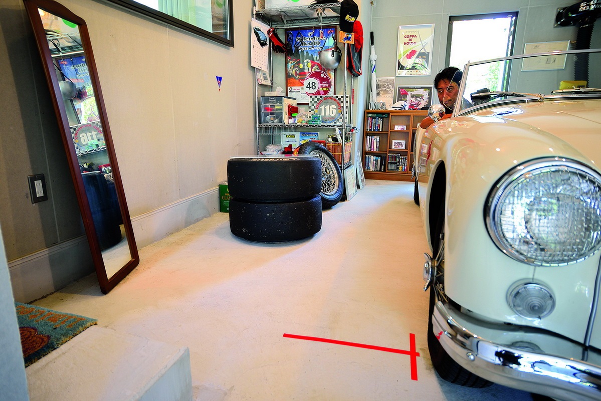 โรงจอดรถที่ทางเราได้ไปขอข้อมูลมาคราวนี้ มี MGA รุ่นปี 1957 Sport Car น้ำหนักเบาจอดอยู่ เมื่อลองสอบถามดูก็รู้ว่า ในตอนที่ได้บ้านอายุ 30 ปีหลังนี้มา โรงจอดรถตอนนี้ยังเป็นห้องสไตล์ญี่ปุ่นอยู่เลย คุณเซคิเนะ ใช้ชีวิตอยู่กันสองคนสามีภรรยา เขาคิดการใหญ่ด้วยการดัดแปลงห้องญี่ปุ่นให้กลายเป็นโรงจอดรถ หลังจากปรึกษาหารือกับผู้รับเหมาที่จะมาดัดแปลงบ้านให้หลายต่อหลายครั้ง โรงจอดรถก็ออกมามีรูปร่างหน้าตาอย่างที่เห็น คุณเซคิเนะบอกว่า “เขาแลกเปลี่ยนความคิดเห็นกับผู้รับเหมาที่จะมาดัดแปลงบ้าน ทั้งที่ไม่รู้ว่าจะทำโรงจอดรถในพื้นที่แคบๆ ให้ออกมามีรูปแบบไหนดี” จนมาจบที่ต้องทำลายผนังห้องสไตล์ญี่ปุ่นกับโครงสร้างเดิมทั้งหมดออกไป แล้วเพิ่มความลึก เพื่อให้มีพื้นที่เพิ่มขึ้น