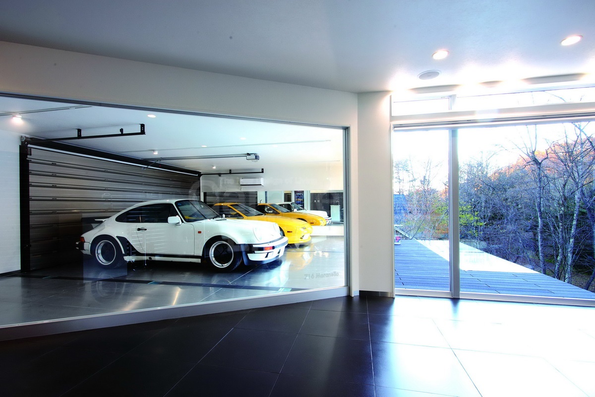 สำหรับพื้นโรงจอดรถ เขาเลือกใช้แผ่นอะลูมิเนียมนำเข้ามาแปรรูป ถึงวัสดุชนิดนี้จะเป็นรอยได้ง่าย แต่ก็ทำให้ดูมีสีสัน ในอนาคตเขาคิดว่าจะเคลือบน้ำยาใสเพื่อป้องกันรอยลงไปอีกชั้นหนึ่ง ห้องที่อยู่ข้างๆ โรงจอดรถปูด้วยหิน ภาพของรถที่มองจากกระจกกว้างถึง 3 เมตรน่าดูมาก เป็นความกลมกลืนของห้องที่ทันสมัยกับทิวทัศน์ตามธรรมชาติขนาดใหญ่ด้านนอกที่มองเห็นจากห้องนั่งเล่น