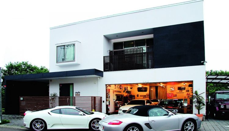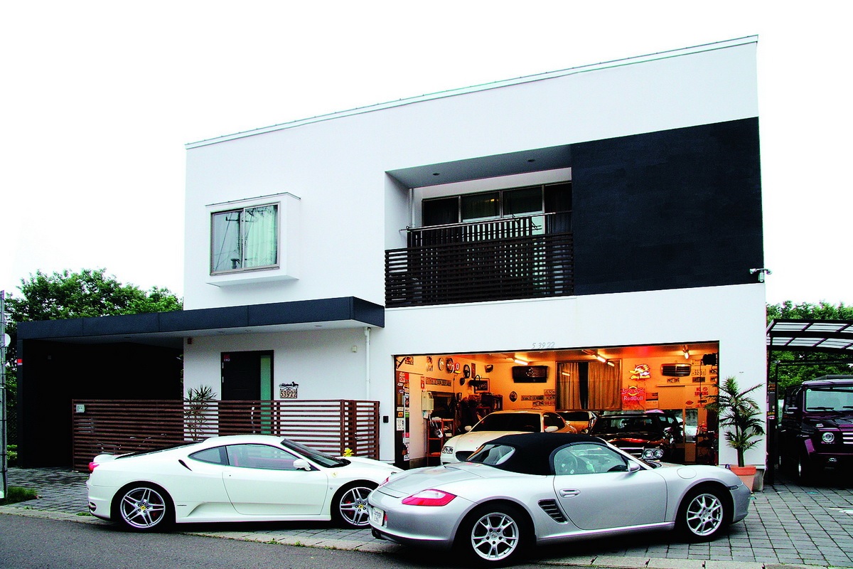 อันที่จริง เจ้าของบ้านเคยไปอยู่ Home Stay ที่อเมริกา ในฐานะนักเรียนแลกเปลี่ยนตอนอายุ 16 ปี จึงได้รับวัฒนธรรมอเมริกันที่ได้เห็นเมื่อครั้งนั้น จนรู้สึกว่าอย่างน้อยก็อยากให้โรงจอดรถเป็นสไตล์อเมริกัน หลังส่งมอบบ้าน ก็นำพวกของจุกจิกอย่างหลอดไฟนีออน ป้ายทะเบียน ฯลฯ ที่ค่อยๆ ซื้อเก็บสะสมมาแต่งเติมทุกครั้งที่มีเวลาว่าง ทำให้ได้โรงจอดรถสไตล์อเมริกันสมกับที่ตั้งใจไว้  กลายเป็น Hobby Room ในชื่อโรงจอดรถที่เต็มไปด้วยบรรยากาศเหมือนกับที่เคยเห็นสมัยวัยรุ่น นอกจากต้องมีพื้นที่ในการจอดรถเรียงกัน 2 คันแล้ว ยังต้องมีพื้นที่เหลือพอสำหรับการทำงาน ในขณะที่ปิดประตูม้วนลงจนมิดได้ด้วย ดังนั้น พื้นที่ที่ใช้ในชีวิตประจำวันส่วนใหญ่ อย่างเช่น ห้องนั่งเล่น จึงต้องยกขึ้นไปไว้บนชั้น 2 ทั้งหมด