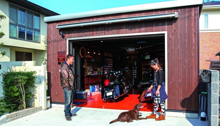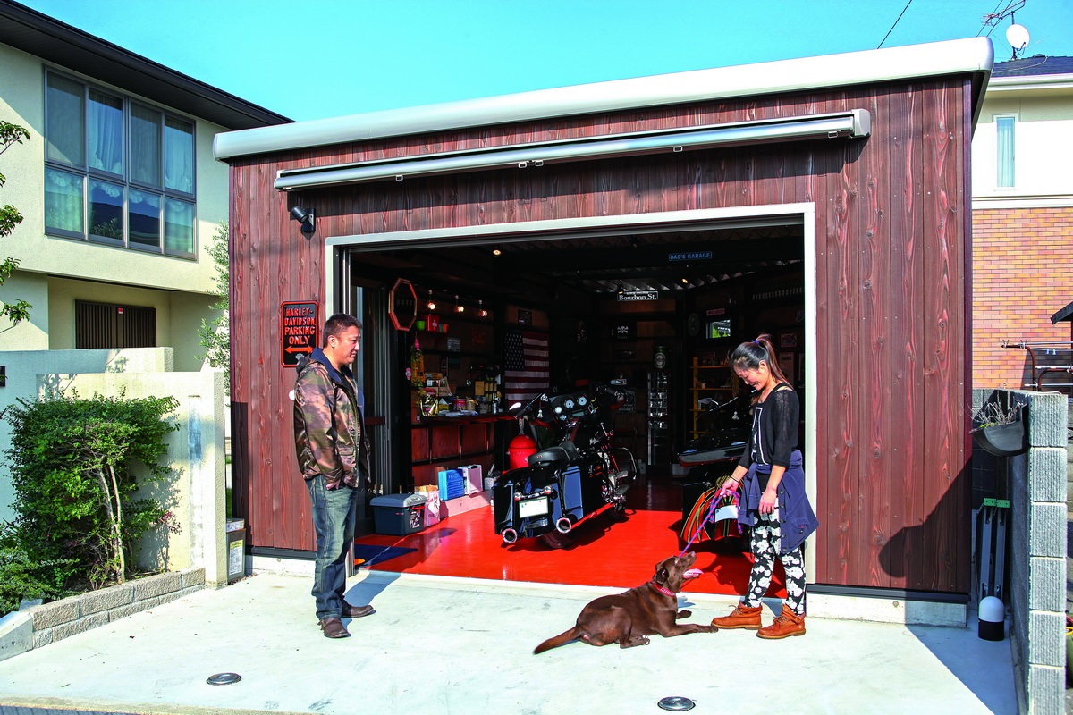 โรงจอดรถสไตล์อเมริกันตั้งสง่าอยู่ในย่านที่อยู่อาศัยอันเงียบสงบตรงเชิงเขาซานุคินานาฟุจินอกจากจะปกป้องรถสุดรักจากอากาศและการโจรกรรมแล้วสำหรับสามีภรรยาคู่นี้ ที่นี่เป็นพื้นที่แห่งความสุข