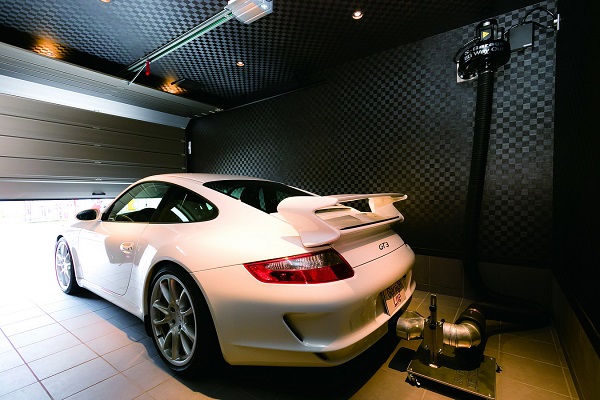 ในโรงจอดรถทราบแล้วว่าจะเป็นที่อยู่ของ Porsche สีขาว ซึ่งจินตนาการได้ว่าจะทำให้บรรยากาศดูหรู ดีไซเนอร์จึงได้เสนอวอลล์เปเปอร์สวยงามโทนสีดำ และระหว่างห้องงานอดิเรกขนาด 10 ตร.ม. ข้างโรงจอดรถ จะติดหน้าต่างกระจก เพราะดีไซเนอร์เข้าใจความรู้สึกของคนรักรถอย่างคุณฟุคุชิมะ และยังมองไปถึงการชื่นชมรถที่ว่าการชมรถจากตำแหน่งต่ำจะสวยงามกว่าจึงได้ทำพื้นให้ต่ำลง และเมื่อคุณฟุคุชิมะได้เห็นโรงจอดรถของเพื่อนที่สร้างก่อนหน้านี้ไม่ได้ติดตั้งระบบดูดควันออกไปภายนอก เขาก็เลยวางแผนไว้ว่าจะติดตั้งเครื่องดูดควันEG WAY OUT ตอนที่กำลังสร้างโรงจอดรถอยู่ เขาได้คำนวณตำแหน่งที่จะติดมอร์เตอร์ไว้ด้วย การจะติดตั้งEG WAY OUT ในโรงจอดรถทำได้ไม่มีปัญหา แต่พอมาดูขนาดของโรงจอดรถกับขนาดของรถ ต้องเปลี่ยนตัวต่อ (Attachment)Offset 50 มม. กว่าของที่เป็นมาตรฐาน ซึ่งงานปรับให้พอดีกับโรงจอดรถเป็นหน้าที่ของคุณฮาเซกาวะ จากบริษัท “Safety Life”
