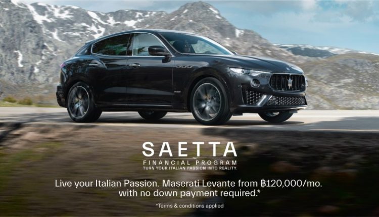 มาเซราติ ประเทศไทย ผู้นำเข้า และจำหน่ายรถยนต์ Maserati อย่างเป็นทางการในประเทศไทย ภายใต้กลุ่มธุรกิจมิลเลนเนียม กรุ๊ป คอร์ปอเรชั่น (เอเชีย) หรือเอ็มจีซี-เอเชีย เปิดตัวโปรแกรมทางการเงินแบบใหม่ ‘SAETTA FINANCIAL PROGRAM’ กับสโลแกน ‘Turn Your Italian Passion Into Reality’ ทางเลือกอันชาญฉลาด ที่ช่วยให้คุณได้ขับรถยนต์ Maserati ง่ายขึ้น รวมถึงมีหลากหลายสิทธิ์พิเศษอีกมาก ที่โชว์รูม มาเซราติ ประเทศไทย โครงการเอ-สแควร์ ซอยสุขุมวิท 26, สยามพารากอน ชั้น 2 และไอคอนสยาม ชั้น 1
