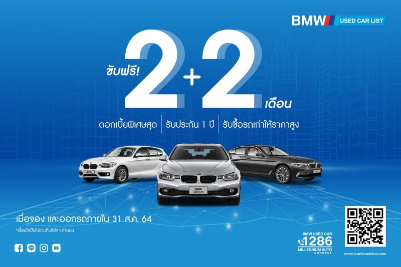 มาสเตอร์ เซอร์ทิฟายด์ ยูสคาร์ ศูนย์รวมรถยนต์มือสองครบวงจร ภายใต้กลุ่มธุรกิจมิลเลนเนียม กรุ๊ป คอร์ปอเรชั่น (เอเชีย) ยกทัพยนตรกรรมระดับพรีเมียม ทั้ง บีเอ็มดับเบิลยู และ เมอร์เซเดส-เบนซ์ ใช้แล้ว สภาพดี หลากหลายรุ่น รวมกว่า 50 คัน พร้อมข้อเสนอสุดพิเศษให้ลูกค้าได้ขับฟรี 2+2 เดือน ที่โชว์รูมบีเอ็มดับเบิลยู ยูสคาร์ มิลเลนเนียม ออโต้ และเบนซ์ ยูสคาร์ ทั้ง 3 สาขา ลาดพร้าว, พระราม 3 และพระราม 4 ตั้งแต่วันนี้-สิ้นเดือนสิงหาคม 2564