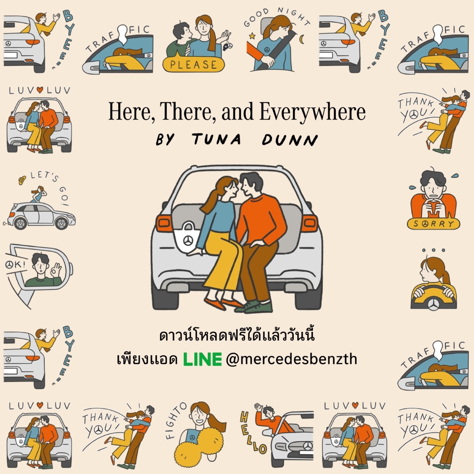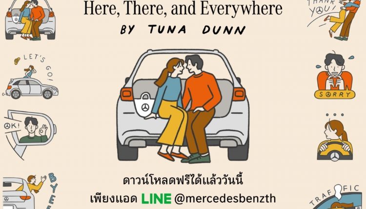 เมอร์เซเดส-เบนซ์ ประเทศไทย ส่งสติกเกอร์ Line ชุดพิเศษ “Here, There and Everywhere” จากฝีมือการดีไซน์ของ Tuna Dunn หรือตุล-ตุลยา ตุลย์วัฒนจิต ศิลปิน-Iillustrator เจ้าของลายเส้นที่มีความโดดเด่นในเรื่องของการบอกเล่าเรื่องราวที่ดูเรียบง่ายแต่โดนใจมาเป็นผู้ออกแบบ พร้อมเปิดให้ดาวน์โหลดตั้งแต่วันนี้เป็นต้นไป