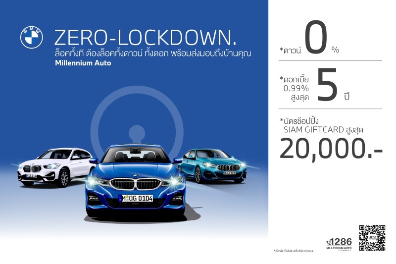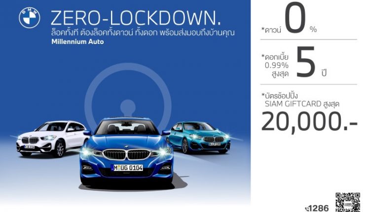 มิลเลนเนียม ออโต้ กรุ๊ป ผู้แทนจำหน่ายรถยนต์ BMW, MINI และ BMW Motorrad จัดแคมเปญพิเศษ ‘ZERO-LOCKDOWN’ ให้ลูกค้าเป็นเจ้าของยนตรกรรมในฝันได้แบบเซฟๆ ด้วยข้อเสนอแห่งปี ล็อกทั้งดาวน์ ทั้งดอกฯ ตลอดอายุสัญญา พร้อมส่งรถให้ถึงบ้าน และแถมฟรี! บัตรช็อปปิ้ง SIAM GIFT CARD สูงสุด 20,000 บาท ให้ใช้จ่ายได้แบบชิคๆ โทร. ด่วน 1286 Millennium Auto Connect เพื่อรับสิทธิ์พิเศษได้ตั้งแต่วันนี้-สิ้นเดือนกรกฎาคม 2564