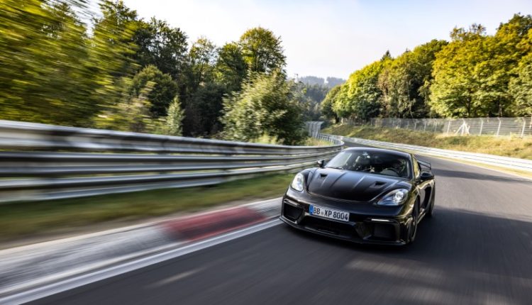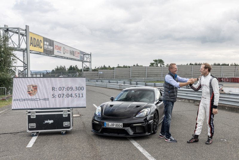 Jörg Bergmeister นักขับทดสอบ และ Porsche Brand Ambassador สามารถทำเวลาหลังพวงมาลัยรถในสายการผลิตปกติต่อรอบสนามนูร์เบิร์กริงต์ ฝั่งเหนือ Nürburgring-Nordschleife ซึ่งมีระยะทาง 20.832 กิโลเมตร ด้วยตัวเลข 7:09.300 นาที โดย New Porsche 718 Cayman GT4 RS สามารถวิ่งครบรอบสนามในเวลาเพียง 7:04.511 นาที ในระยะทาง 20.6 กิโลเมตร ซึ่งเร็วกว่าสถิติเดิมที่ 718 Cayman GT4 ที่ทำไว้ถึง 23.6 วินาที และเพื่อป้องกันอันตรายที่อาจเกิดขึ้นกับผู้ขับขี่ขณะทดสอบ รถสปอร์ตเครื่องยนต์วางกลางคันนี้ จึงได้รับการติดตั้งเบาะนั่งสำหรับการแข่งขัน และยางรถยนต์ Michelin Pilot Sport Cup 2 R ที่สามารถเลือกสั่งเป็นอุปกรณ์พิเศษเพิ่มเติมได้ โดยจะมีเจ้าหน้าที่ให้การรับรองมาตรฐานในเรื่องของสภาพตัวรถและน้ำหนัก