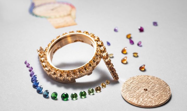 สีเขียว และ แซฟไฟร์ไล่เฉดตั้งแต่ สีแดง ส้ม เหลือง น้ำเงิน อินดิโก ไปจนถึงสีม่วง โดยร้อยเรียงแต่ละเม็ดด้วยเทคนิค Serti Descendu ที่ช่วยเผยให้เห็นประกายงามได้ชัดเจนกว่าการฝังลงไปในเนื้อทองแบบที่ใช้ทั่วไปในปัจจุบัน