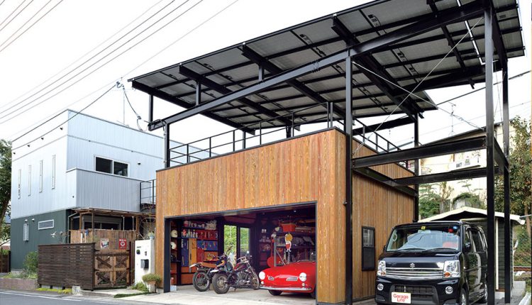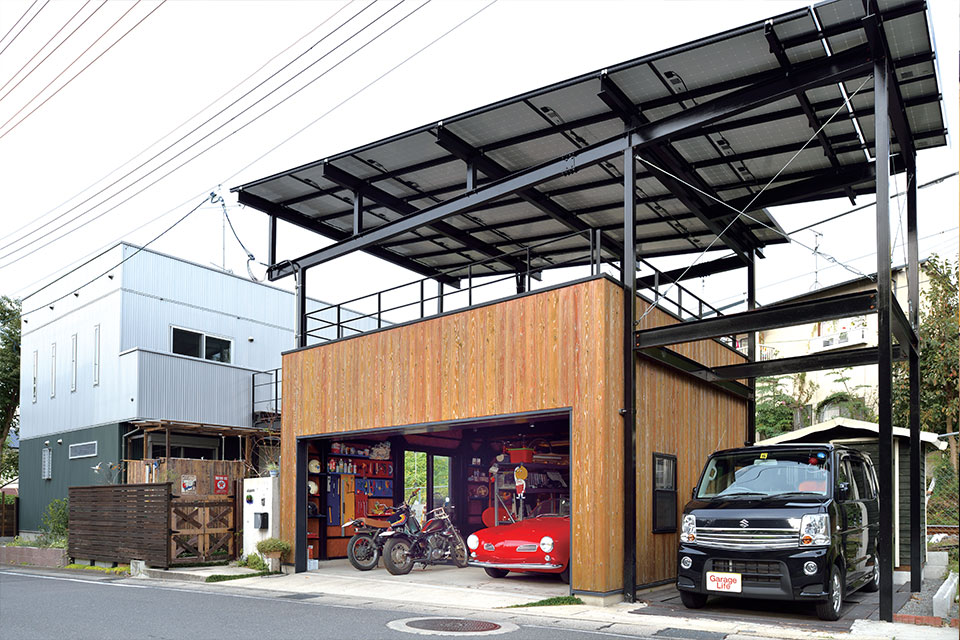 คุณฮาชิโมโตะออเดอร์ว่า “ไม่ได้เอาไว้เก็บรถยนต์กับมอเตอร์ไซค์เท่านั้น อยากให้เก็บพวกหนังสือได้ด้วย” คุณฮาชิโมโตะและภรรยาชอบมอเตอร์ไซค์ พวกเขาไม่เพียงแต่มีงานอดิเรกที่เหมือนกัน แต่ยังให้เกียรติในแต่ละมุมมองซึ่งกันและกันด้วย สำหรับโรงจอดรถก็ต้องการทำให้ดีที่สุด เพราะจะเป็นเวทีที่ให้ได้ใช้ไลฟ์สไตล์อย่างสนุก เพื่อให้ได้ตามออเดอร์ บริษัทได้พิจารณาถึงพื้นที่ที่ตั้งอยู่ตามแนวทางรถไฟและการนำพลังงานแสงอาทิตย์มาใช้ นอกจากนี้ได้เสนอโรงจอดรถที่มีระเบียงทางเดินเชื่อมต่อไปยังบ้านด้วย โรงจอดรถนี้สำหรับจอดรถคันใหม่ สามารถรองรับจำนวนสมาชิกในครอบครัวที่เพิ่มขึ้นได้ โรงจอดรถที่มีคุณสมบัติขยายตัวได้สูงแบบนี้ ถือเป็นความภาคภูมิใจของบริษัท