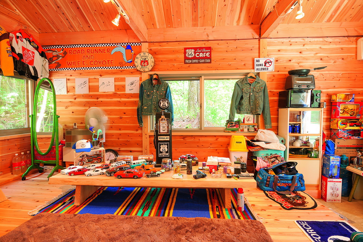 ห้องนั่งเล่นที่ทำด้วยไม้กระดานอยู่สบาย คุณฮาเซงาวะ เป็นคนที่ชอบของสไตล์อเมริกันมาก ทั้งรถ ของจุกจิก และเสื้อผ้า ฯลฯ เขาพอใจมากที่สามารถเก็บของเกี่ยวกับงานอดิเรกไว้ด้วยกันในนี้