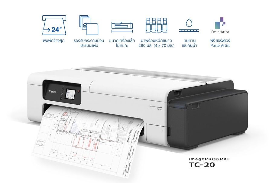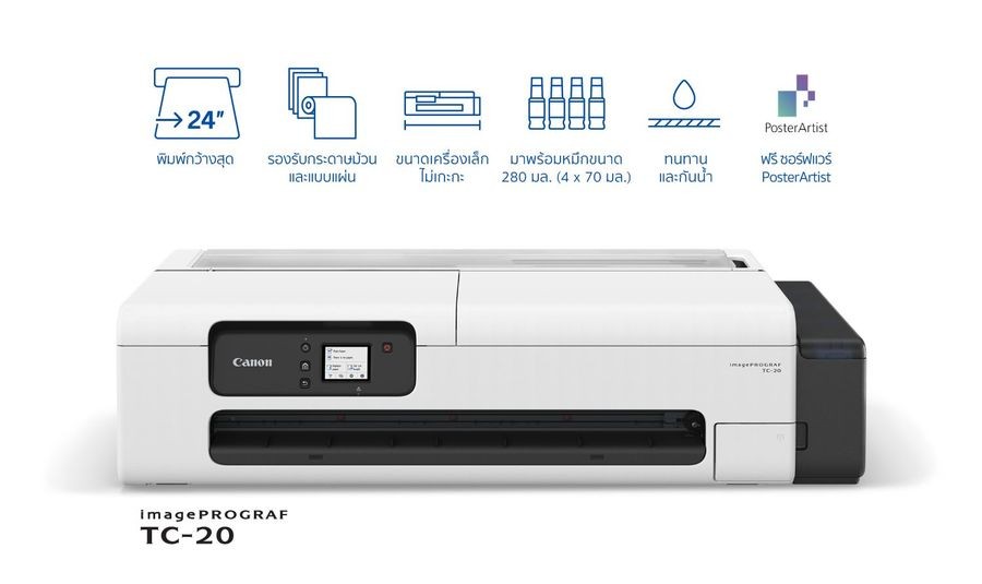 แคนนอน (CANON) แบรนด์ผู้นำด้านเทคโนโลยีอิมเมจจิ้งระดับโลก เปิดตัว imagePROGRAF TC-20 เดสท็อปพรินเตอร์ 4 สี (pigment) แบบหน้ากว้างรุ่นแรกที่รองรับกระดาษขนาดใหญ่ระดับ A1 เพื่อตอบสนองการพิมพ์งานบนสื่อขนาดใหญ่ในพื้นที่ทำงานขนาดเล็ก โดยเครื่องพิมพ์ TC-20 ยังรองรับการทำงานแบบไฮบริดและการทำงานทางไกลในธุรกิจหลายประเภท โดยเฉพาะงานของสถาปนิก วิศวกร และช่างรับเหมาก่อสร้าง รวมถึงแวดวงการศึกษาและธุรกิจค้าปลีกต่าง ๆ โดยใช้ได้กับกระดาษม้วนหน้ากว้างสูงสุดถึงไซส์ A1 พร้อมตัวป้อนกระดาษ (Auto Sheet Feeder: ASF) แบบบิลต์อิน สามารถพิมพ์สื่อขนาด A3/A4 ได้อย่างต่อเนื่องเพื่อช่วยเพิ่มกำลังการผลิตได้สูงสุด นอกจากนี้ยังใช้งานได้กับซอฟต์แวร์และแอปพลิเคชันฟรีอื่น ๆ เช่น PosterArtist ซึ่งทำให้เครื่องพิมพ์ TC-20 ใช้งานง่าย มอบความสะดวกสบายในการใช้งานได้อย่างดีเยี่ยมเช่นเดียวกับเครื่องพิมพ์หน้ากว้างระดับไฮเอนด์อื่น ๆ ในซีรีส์ imagePROGRAF