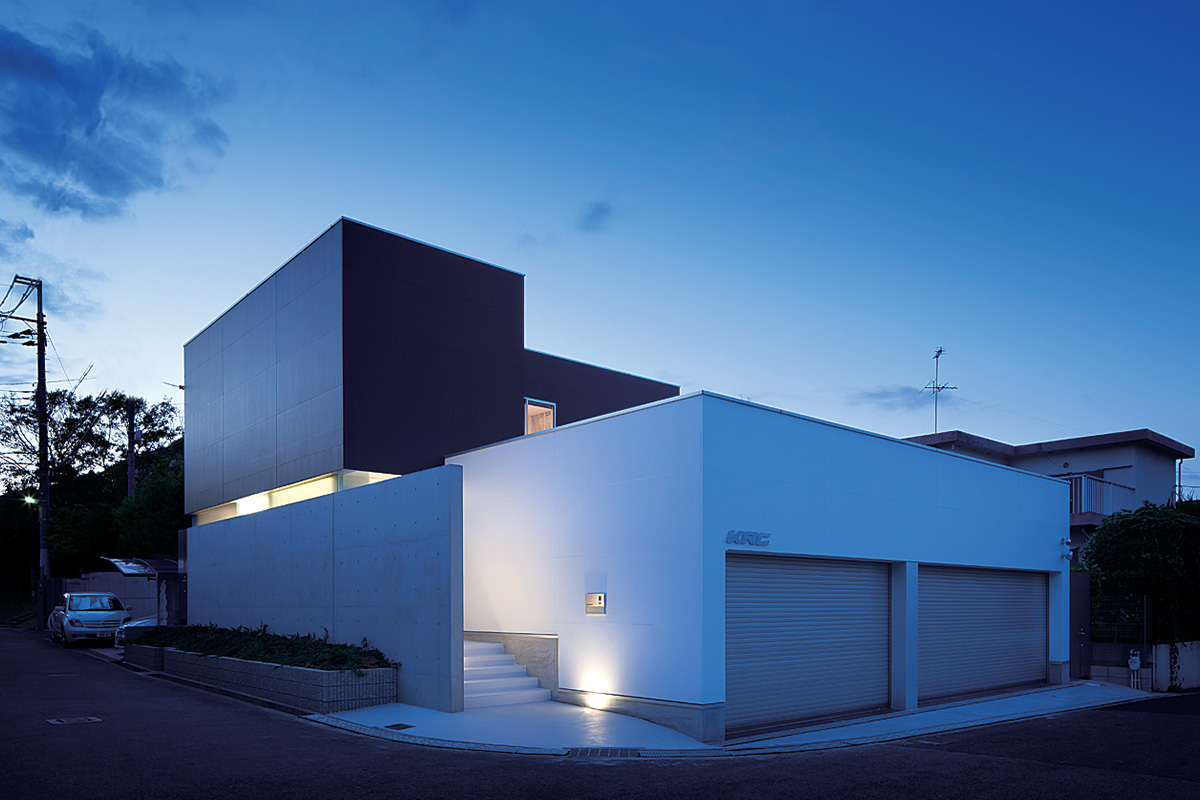 ด้านนอกตัวบ้าน ชั้น 1 ปล่อยให้เป็นสีพื้นคอนกรีต ส่วนชั้น 2 ทาเป็นสีดำสนิท มีช่องหน้าต่างแบบ slit คั่นกลาง ทำให้ดูเหมือนชั้น 2 ลอยอยู่กลางอากาศ ดีไซน์ที่ไดนามิกและดูกล้าเสี่ยงแบบนี้กลายเป็นสิ่งที่เจ้าของบ้านรู้สึกพอใจมากขึ้น สร้างเสร็จออกมาเป็นที่ที่หาที่เปรียบไม่ได้ สำหรับให้เขาได้อยู่ร่วมกับรถยนต์และมอเตอร์ไซค์