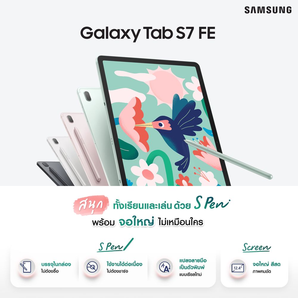 ซัมซุงแนะนำ Galaxy Tab S7 FE แท็บเล็ตรุ่นใหม่ ที่รวมฟีเจอร์สุดโปรดของเหล่าแฟนๆ จากแท็บเล็ตรุ่นแฟลกชิปไว้ในเครื่องเดียว ไม่ว่าจะเป็นหน้าจอขนาดใหญ่ถึง 12.4 นิ้ว ปากกา S Pen ในกล่องไม่ต้องซื้อเพิ่มและไม่ต้องชาร์จแบตเตอรีให้เสียเวลา พร้อมฟีเจอร์ Multi-Active Window เพื่อการใช้งานหลายหน้าต่างพร้อมกัน และฟีเจอร์ Multi instance เพื่อสร้าง Shortcut ให้สามารถทำงานพร้อมกันได้ถึงสามแอปพลิเคชันได้อย่างง่ายดาย มอบประสบการณ์ Multi-Tasking ทั้งเรียนและเล่นได้อย่างไหลลื่นไม่มีสะดุด จะเรียนออนไลน์หรือทำโปรเจกต์ ไม่ว่าเอกสารจะเยอะแค่ไหน Galaxy Tab S7 FE ก็พร้อมทุกสถานการณ์ ด้วย S Pen ที่มาพร้อมตั้งแต่เปิดกล่อง และสุดยอดฟีเจอร์ใน Samsung Notes ที่ช่วยเปลี่ยนการจดด้วยลายมือให้กลายเป็นข้อความตัวพิมพ์ทั้งภาษาไทยและภาษาอังกฤษได้อย่างง่ายดายและเรียลไทม์ พร้อมจัดระเบียบบันทึกต่างๆ ด้วยแท็กอัตโนมัติ และการค้นหาอัจฉริยะเพื่อการใช้งานโน้ตที่ต้องการได้ทันที รวมถึงฟีเจอร์ Multi-Active Window เพื่อการใช้งานหลายหน้าต่างพร้อมกัน และฟีเจอร์ Multi instance เพื่อจับคู่แอปพลิเคชันและสร้าง Shortcut ให้สามารถทำงานพร้อมกันได้ถึงสามแอปพลิเคชันในหน้าจอเดียว ไม่ว่าจะท่องอินเทอร์เน็ต จดโน้ต หรือแม้แต่การรับชมวิดีโอสตรีมมิ่งก็สามารถทำได้ในเวลาเดียวกัน