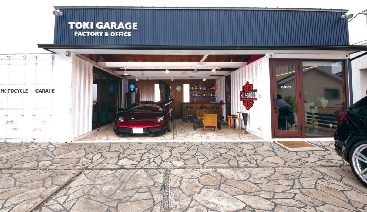 โรงจอดรถที่เขียนชื่อไว้ว่า TOKI GARAGE นั้น ตั้งอยู่ในจังหวัดกิฟุ เมื่อก้าวออกไปหนึ่งก้าว จะเห็นว่าบริเวณโดยรอบยังเป็นไร่นาอยู่ ในพื้นที่เดียวกันกับโรงจอดรถนั้นก็มีบ้านหลังใหม่สร้างขึ้นเรียงกันด้วย ต่อจากนี้ไปคงจะมีจำนวนคนเพิ่มขึ้นเป็นแน่ คุณโทกิที่บอกว่าสร้างบ้านของตัวเองขึ้นช่วงเดียวกับบ้านหลังอื่นรอบๆ นั้น เปิดบริษัทที่เกี่ยวกับการก่อสร้าง จึงมีที่ดินข้างๆ สำหรับเป็นที่วางวัสดุอุปกรณ์ “เดิมผมเคยขับ Harley พอลองคิดถึงสถานที่จอดแล้วก็เลยเตรียมตู้คอนเทนเนอร์เอาไว้ แล้วก็เตรียมตู้คอนเทนเนอร์สำหรับใส่วัสดุก่อสร้างไว้อีกตู้หนึ่งด้วย” คุณโทกิกล่าว เมื่อลองมองดู TOKI GARAGE ให้ชัดๆ มองจากด้านหน้าจะเห็นเป็นตู้คอนเทนเนอร์ตั้งไว้ทั้งสองฝั่ง เชื่อมทั้งสองตู้ด้วยโครงเหล็ก แล้ววางหลังคาลงไปให้เป็นโรงจอดรถ เนื่องจากทาด้วยสีขาวสะอาดตา คงมีคนที่ไม่ทันเอะใจว่านี่เป็นตู้คอนเทนเนอร์ด้วยเช่นกัน ปัจจุบันมีการรีโนเวทตู้คอนเทนเนอร์ฝั่งหนึ่งให้เป็น Private office และใช้อีกฝั่งเป็นที่วางวัสดุอุปกรณ์ แล้วสร้างพื้นที่โรงจอดรถสำหรับจอดรถ 2 คันขึ้นมาตรงกลาง ในโรงจอดรถที่ว่ามานั้นมี Murcielago ซึ่งมีจำนวนเพียง 20 คันบนโลก ที่จัดทำเป็นพิเศษโดย LB☆WORKS จอดอยู่ และยังมีเคาน์เตอร์บาร์ด้วย ใช้หน้าต่างกระจกล้อมด้วยกรอบไม้ ตกแต่งพื้นผิวภายในด้วยไม้ ฯลฯ เป็นพื้นที่ที่คาดไม่ถึงเลยว่าจะนำตู้คอนเทนเนอร์ทั่วไปมาทำ อาจจะกล่าวได้ว่าสร้างขึ้นมาเพื่อให้คิดว่าอาจจะเป็น Container Garage ก็เป็นได้