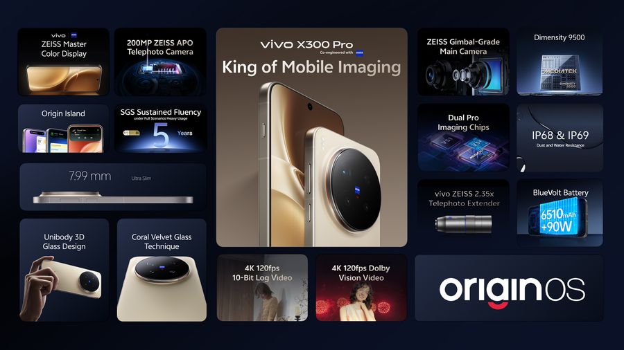 vivo X300 Series เผยนิยามใหม่ของการซูมที่จะเติมเต็มความสนุกให้กับทุกการใช้งานโดยไม่ต้องปรับตั้งค่าใด ๆ ให้ยุ่งยาก ด้วยเทคโนโลยีกล้องเทเลโฟโต้ความละเอียดสูงพิเศษ 200 ล้านพิกเซล และชุดเลนส์เสริมกำลังขยาย 2.35 เท่า (vivo ZEISS 2.35x Telephoto Extender) ที่พัฒนาร่วมกับพันธมิตรผู้เชี่ยวชาญอย่าง ZEISS รองรับโหมดการถ่ายภาพที่หลากหลาย ไม่ว่าจะเป็นโหมดเวที ทิวทัศน์ พอร์ตเทรต และวิดีโอ รับประกันการใช้งานลื่นไหลด้วยขุมพลัง MediaTek Dimensity 9500 และ vivo Imaging Chip V3+ พร้อมระบบปฏิบัติการใหม่ OriginOS 6 บน Android 16 ตั้งแต่แกะกล่อง รองรับการใช้งานตลอดวันด้วยแบตเตอรี่ขนาดใหญ่ 6040mAh บน X300 และ 6510mAh บน X300 Pro และเทคโนโลยีชาร์จไว 90W FlashCharge แบบมีสายและ 40W FlashCharge ไร้สาย พร้อมรับรองสุขภาพแบตเตอรี่ 5 ปี นอกจากนี้ ตัวเครื่องยังทนทานสำหรับการใช้งานในทุกสถานการณ์ด้วยมาตรฐาน IP68 & IP69 ทนน้ำทนฝุ่น เสริมความแข็งแกร่งด้วยฝาหลังกระจกกันกระแทกระดับโปร ที่ผ่านการทดสอบการตกกระแทกตามมาตรฐาน
