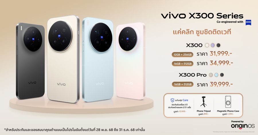 vivo X300 Series เปิดให้จับจองเป็นเจ้าของได้แล้วตั้งแต่วันนี้ ที่ vivo Brand Shop ทุกสาขา ช่องทางออนไลน์ และตัวแทนจำหน่ายทั่วประเทศ โดย vivo X300 วางจำหน่ายในสองรุ่นความจุ ได้แก่ รุ่น 12GB + 256GB ในราคา 31,999 บาท และรุ่น 16GB + 512GB ในราคา 34,999 บาท ในขณะที่ vivo X300 Pro จัดเต็มความจุ 16GB + 512GB ในราคา 39,999 บาท